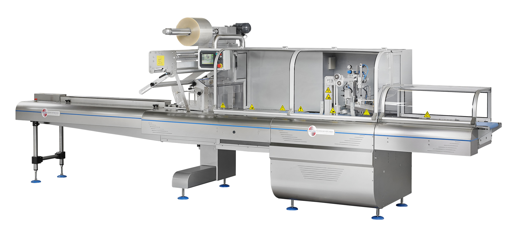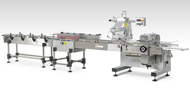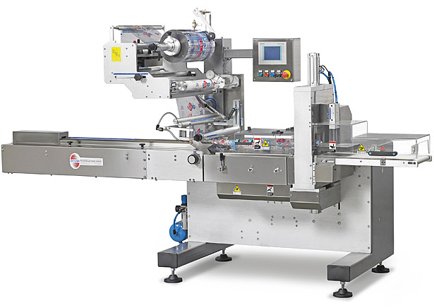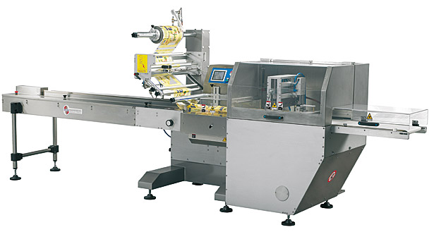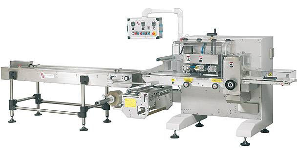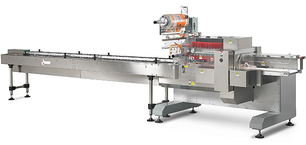 PEGASO 600 pakowaczka pozioma typu flow – packPakowaczka z bębnem folii umieszczonym w górnej części urządzenia z zespołem zgrzewająco–tnącym typu „long dwell” do opakowań typy pillow – pack ze zgrzewem hermetycznym przy wysokich wydajnościach produkcyjnych. Produkowana w wersji elektronicznej. Ten model przeznaczony jest do pakowania produktów w atmosferze modyfikowanej. Standardowa szerokość bębna folii max 600 mm |