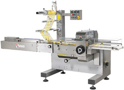 Automatyczny system załadunku np. pieczywa krojonego. Orion 700 linia pakująca z obrotowymi wałkami bocznymi.Przeznaczony do załadunku opakowań typu pillow pack i produktów krojonych (np. kromki pieczywa). Może być sprzężony bezpośrednio z linią produkcyjną lub krajalnicą jak również może być załadowywany w sposób manualny. System ten jest wyposażony w zespół łańcuchów bocznych, który doprowadza produkt aż do momentu zgrzania i odcięcia opakowania. Wydajność produkcyjna ok. 30-50 opakowań/min. |