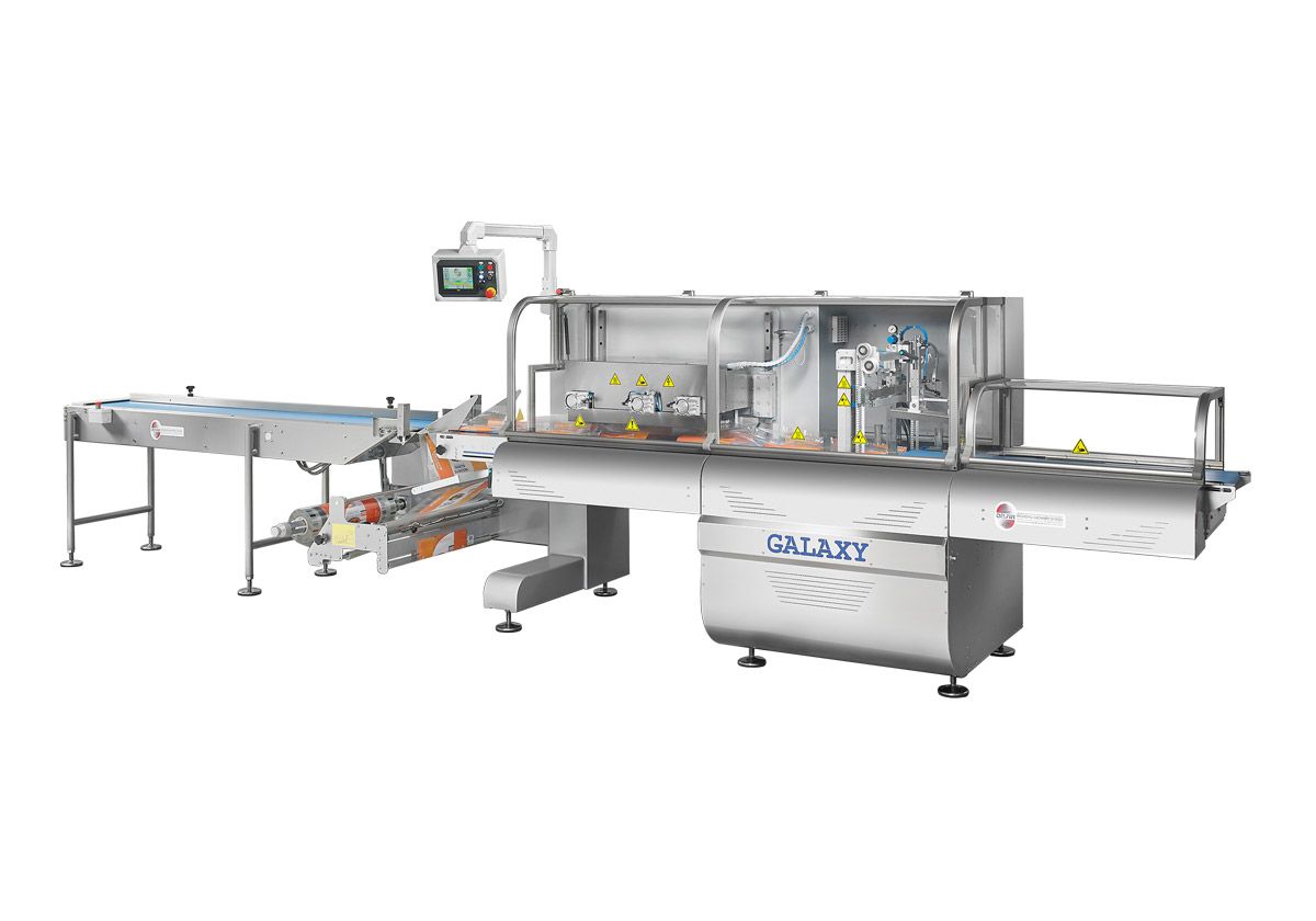 GALAXY 700 pakowaczka pozioma typu flow – packPakowaczka z bębnem folii umieszczonym w dolnej części urządzenia z głowicą kroczącą. Produkowana w wersji elektronicznej. Ten model przeznaczony jest do pakowania produktów w atmosferze modyfikowanej. Materiał pakujący zgrzewany na gorąco (opcjonalnie polietylen). Standardowa szerokość bębna folii max 700 mm (opcjonalnie 800 mm). |